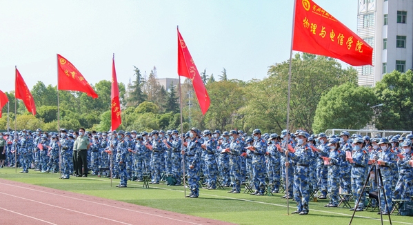 漆昌柱在大会上讲话并作军训动员,他对新生的到来表示热烈的欢迎,希望新生以“四心”启航新征程 用奋斗担当新使命:一要保持爱国心,胸怀国之大者。希望同学们向优秀校友学习,以优秀老师为榜样,始终心怀“国之大者”,把自己的小我融入祖国的大我、人民的大我之中,不畏困难,追求卓越,争创一流,努力成为“对国之大者心中有数”的坚定践行者。二要保持好奇心,勤奋刻苦学习。希望同学们珍惜大学学习时光,心无旁骛求知问学,沉下心来,多读经典,沿着求真理、悟道理、明事理的方向前进,占领知识本领的高峰,去赢得主动、赢得优势、赢得未来。三要保持上进心,勇担复兴大任。希望同学们始终保持上进心,每天努力一点点,每天进步一点点,通过完成一个个小目标,积少成多,最终实现人生大目标,以实际行动担当民族复兴大任。四要保持持久心,书写精彩人生。无论做什么事,都要懂得坚持,做踏踏实实走好每一步的有志者,一步一个脚印地朝着梦想的方向前进。最后,他希望同学们始终谨记“厚德、博学、力行、致远”的校训,以“四心”启航新征程,用奋斗担当新使命。勤奋学习、砥砺奋进,努力成为堪当民族复兴重任的时代新人,奋力书写属于自己的青春华章。