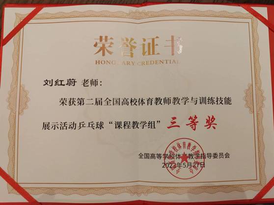 本次比赛由全国高等学校体育教学指导委员会主办,浙江财经大学承办。共吸引了全国二十八个省市自治区,一百四十六所高校近200名体育教师参赛。比赛分网络评审与现场测试两环节,其中网络评审项目为教学(指导)设计与教学(指导)实践,现场测试项目为体能与专项技能。刘红蔚经过精心准备和稳定发挥,最终获乒乓球课程教学组三等奖。