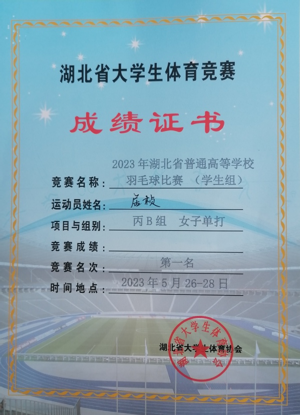本网讯 5月26日-28日,2023年湖北省普通高等学校学生组羽毛球比赛(学生组)在武汉大学卓尔体育馆举行,我校派出教练员王其文、袁建军及17名运动员参赛。经过激烈角逐,我校获得丙B(体育专业)组女子团体冠军。男队获得丙B(体育专业)组男子团体第四名。在单项比赛中,我校获得组丙B(体育专业)组女子单打冠军,并获得男双第五名、混双第五名、女单第八名的好成绩。